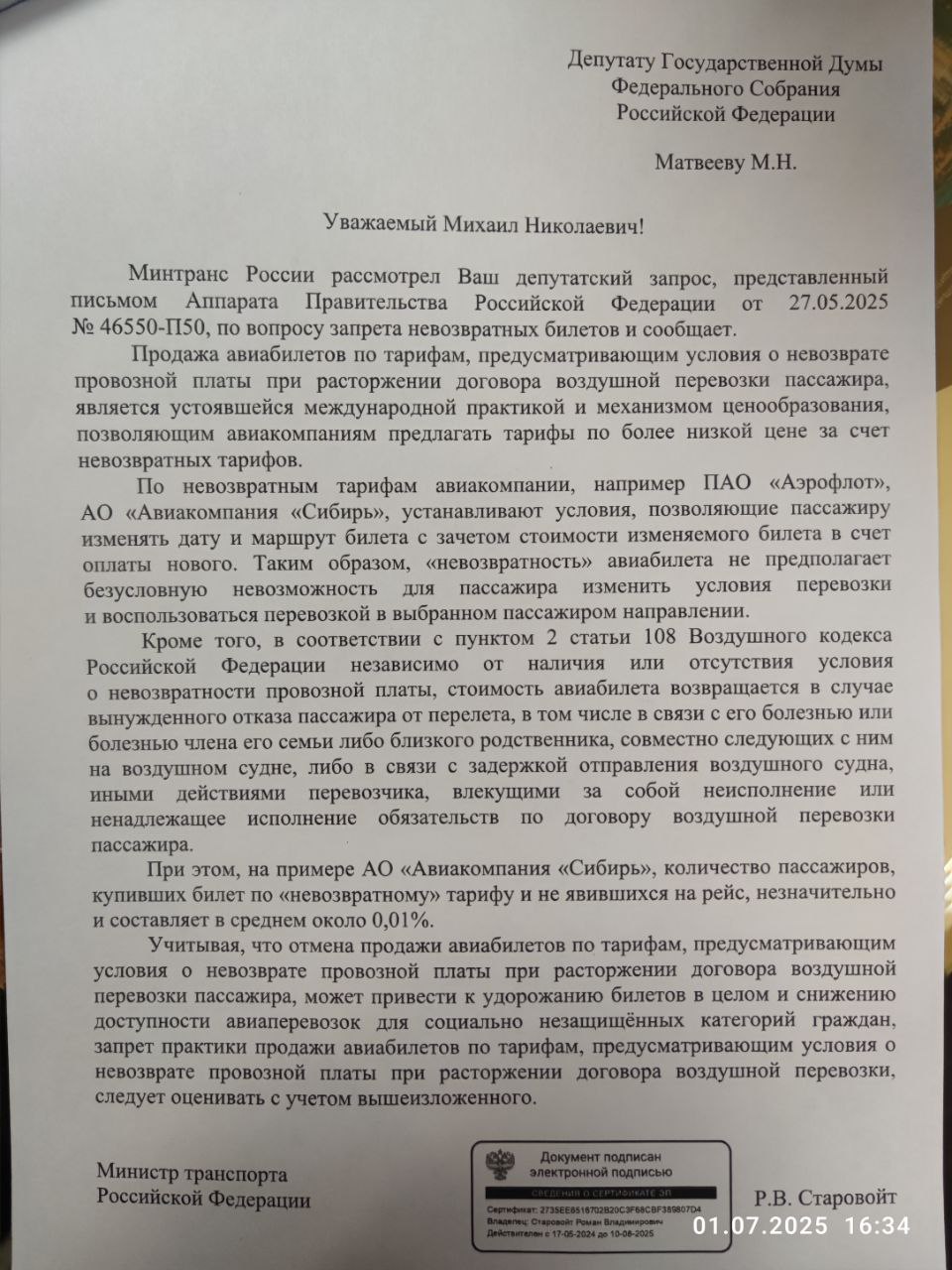 Напомню, некоторое время назад я обратился к председателю Правительства Мишустину с предложением запретить авиакомпаниям невозвратные тарифы, так как "кресла" просто пропадают, если у пассажира случилась отмена поездки: не имея возможности получить хотя бы символическую компенсацию за билет, люди просто не сообщают об отмене поездки и другие не могут купить это кресло.