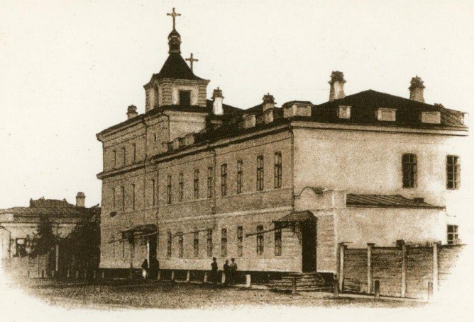 Исторический комплекс появился в первой половине XIX века: двухэтажный дом в стиле классицизма и каменный флигель принадлежали И.П. Толкачеву. В 1870 году здание переоборудовали под женскую прогимназию, выполнив большие пристройки. С 1885 года здесь размещалось Епархиальное училище, а в 1909-м рядом построили новый корпус. Старое здание затем использовалось как жилое и хозяйственное.
