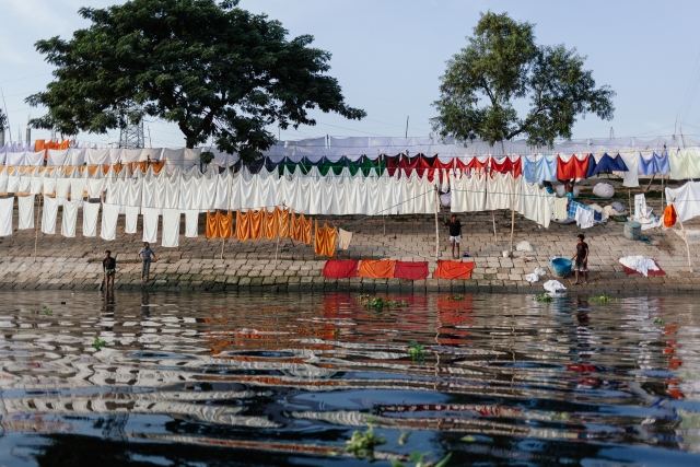 На ее же берегах занимаются и обработкой кожи — весьма распространенная работа, тут же дымят плавильные цеха, сортируется пластик, грузчики разгружают баржи с лесом, и здесь же мужчины стирают белье, красиво развешивая цветные и белые простыни вдоль берегов почерневшей реки. Зарплата на таких работах — от трех до семи долларов в день.