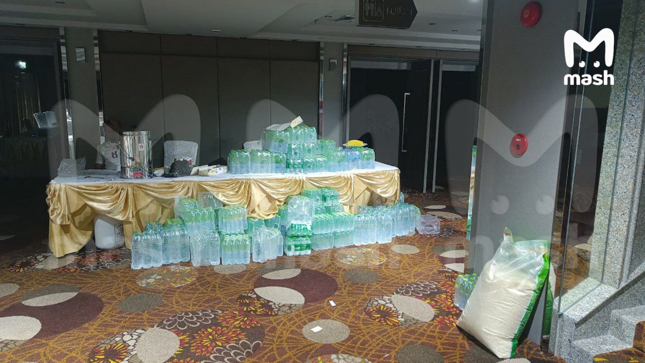 Всего в New Season Square застряло около 50 приезжих с детьми. Среди них трое фарангов: 50-летний новосибирец Евгений, американец и канадка. У них остался небольшой запас воды, кофе, сахара и портативная горелка. Отель предоставляет горячее питание.