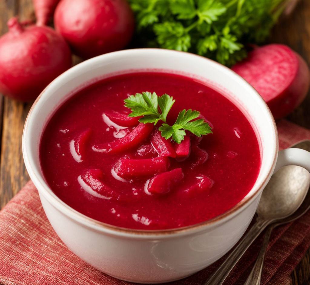 3. Вскипятите бульон. Добавьте свёклу, измельчённый чеснок, соль, сахар и лимонный сок.