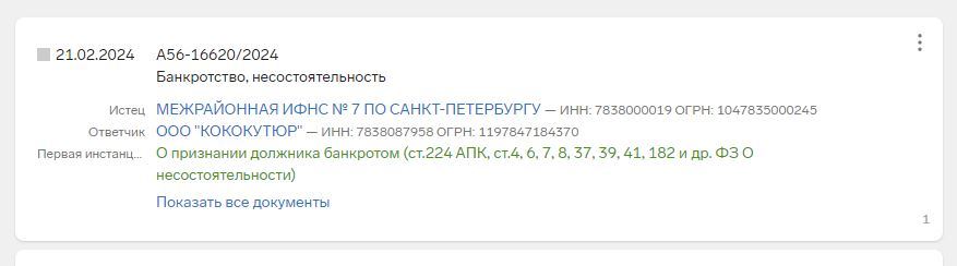Сайт «Кококутюр» уже не работает. По данным «Контур.Фокус», компания Шнуровой выступает ответчиком по делам на общую сумму 1,4 млн рублей. Долги появились в 2022 году в результате проигранных дел с поставщиком фруктов и овощей и предприятием по сбору отходов.