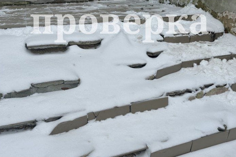 Проверка показала, что ступени на входе по всей своей поверхности деформированы, плитка поломана (местами отслоилась или полностью отстала), а козырек разрушен. Опасные участки при этом ограничили лишь частично.