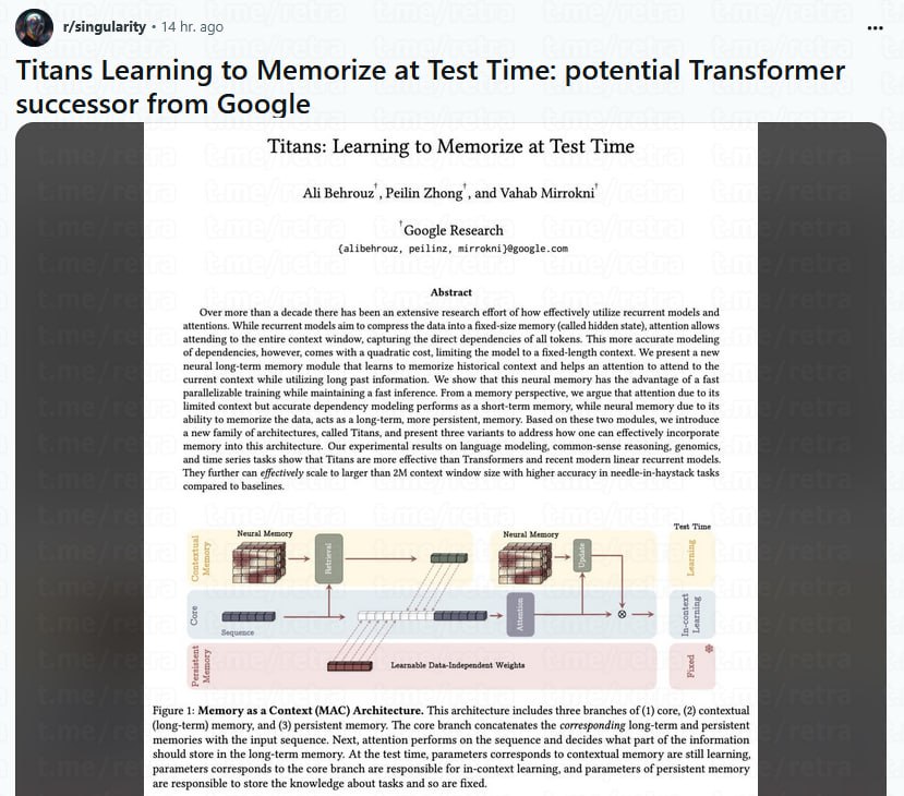 Например, если в контекстном окне GPT-4 всего 4 тысячи токенов, в Titans их 2 миллиона. То есть буквально можно проанализировать примерно 25 средних книг за раз.