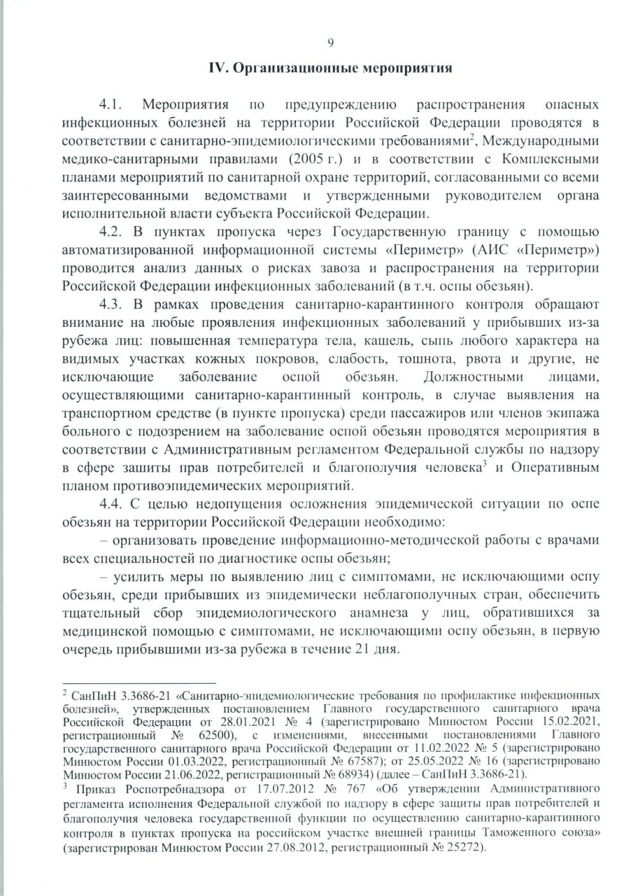 🗯 «Усилить меры по выявлению лиц с симптомами, не исключающими оспу обезьян, среди прибывших из эпидемически неблагополучных стран, обеспечить тщательный сбор эпидемиологического анамнеза у лиц, обратившихся за медицинской помощью с симптомами, не исключающими оспу обезьян, в первую очередь прибывшими из-за рубежа в течение 21 дня», — говорится в документе.