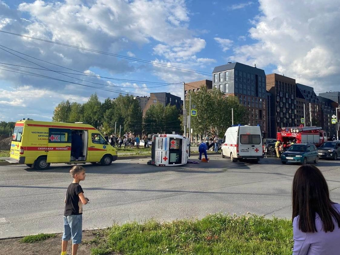 Машина скорой помощи перевернулась в Новосибирске — видео с места ДТП