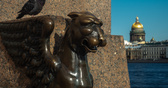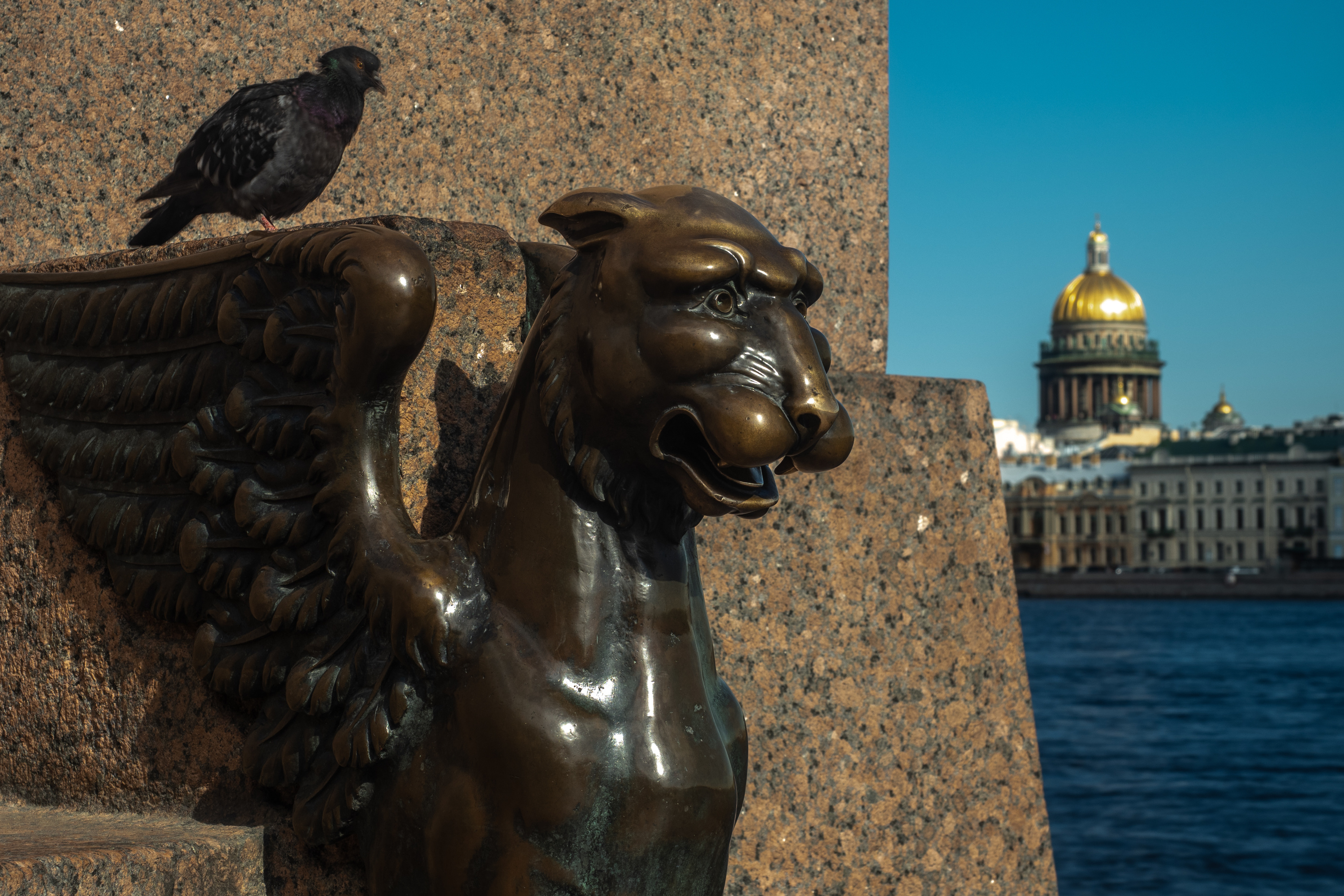 Между сфинксами, по бокам от спуска к Неве, в очертания набережной вписаны две гранитные скамьи. У них тоже есть маленькие охранники — бронзовые грифоны. Грифоны выполнены не целиком: из скамьи выступают голова, грудь, передние лапы и крылья.