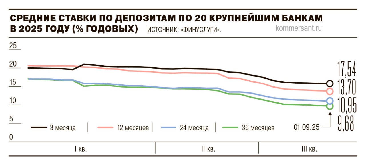 Средние ставки по вкладам в топ-20 банков достигли минимальных значений с начала 2025 года. Сильнее всего с начала 2025 года снизились ставки по трехлетним вкладам — сразу на 7,44 п. п., до 9,62% годовых. Меньше всего снижение затронуло краткосрочные продукты: ставки по трехмесячным депозитам уменьшились на 4,43 п. п., до 15,59% годовых. Ставки по вкладам на полгода и на год составили 14,58% и 13,49% соответственно.