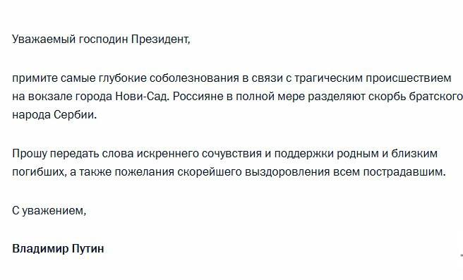 Президент России выразил соболезнования главе Сербии в связи с трагедией на вокзале Нови-Сада, где при обрушении козырька погибли 14 человек.