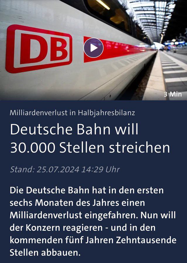 Немецкая железная дорога Deutsche Bahn намерена сократить 30 000 рабочих мест. Компания прославилась отменами поездок и постоянными опозданиями. https://t.me/banksta/55505