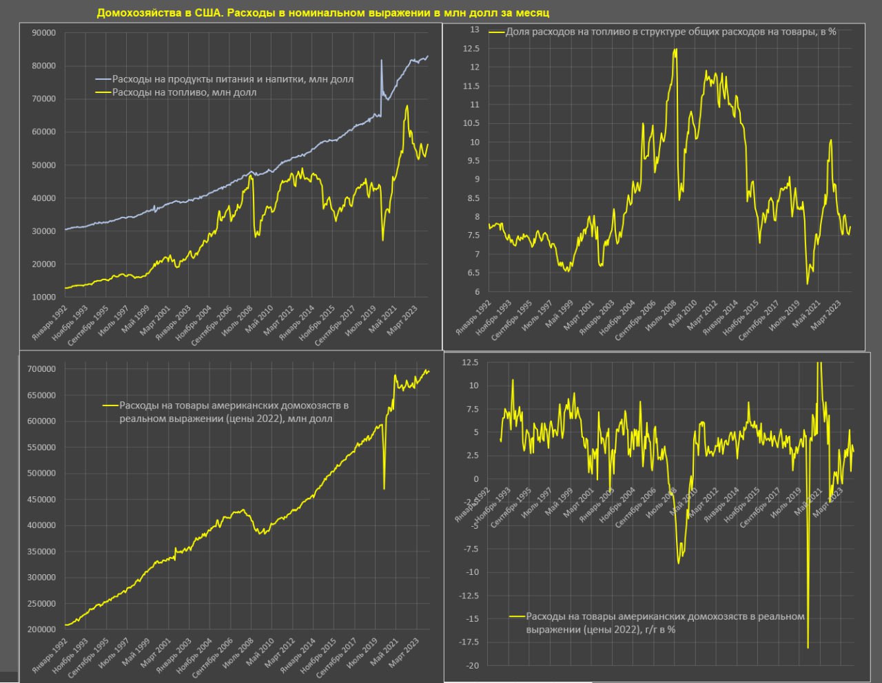 С 2011 по 2019 включительно среднегодовой рост розничных продаж в реальном выражении был 4.1%. За счет агрессивной фискальной и монетарной поддержки в совокупности с безумием американских потребителей удалось сохранить докризисный темп с 2020 по 2023 включительно на уровне 4.2% годовых (немного выше исторического тренда), где основной эффект реализации был в 2020-2021.