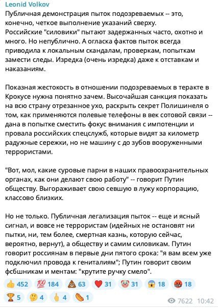Это не просто глупость и цинизм. Такие, как Леонид Волков (иноагент и лицо, причастное к экстремизму и терроризму), фактически, соучастники - они осуществляют информационное сопровождение теракта, чтобы придать ему в мире и частично в России нужное заказчикам звучание. https://t.me/block_ru/6272