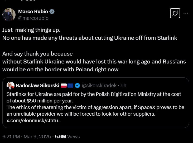 Без Starlink Украина бы давно проиграла войну, а Россия сейчас была бы на границе с Польшей – Рубио