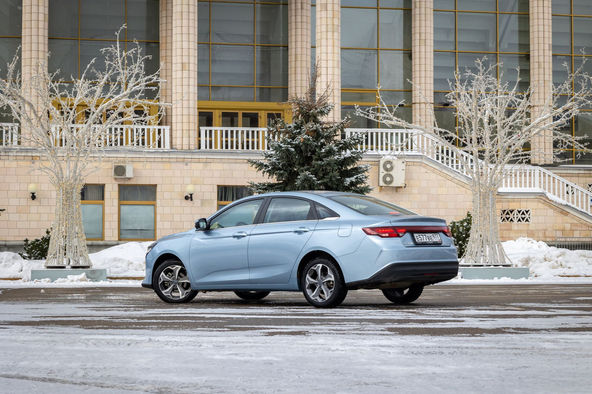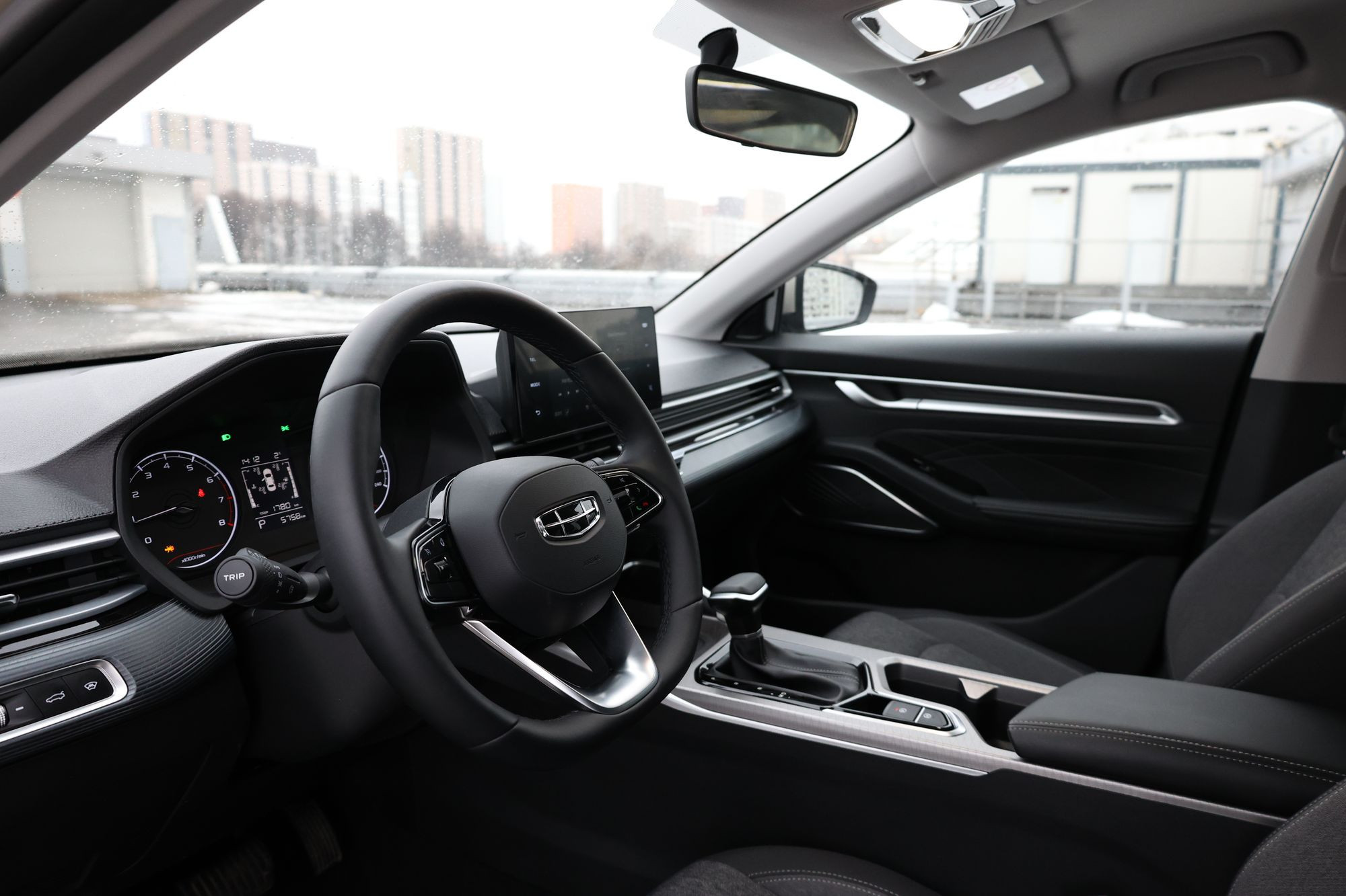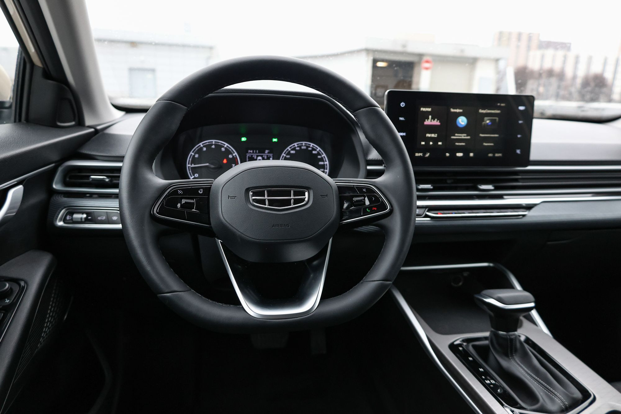 Версии с автоматом стоят 2,22, 2,31 и 2,49 миллиона рублей. В оснащении всех есть датчики давления в шинах, выбор из трех ездовых режимов (Eco, Normal и Sport), однозонный климат-контроль, авторежим для всех стеклоподъемников, бесключевой доступ и запуск двигателя, функция дистанционного запуска мотора кнопкой на брелоке, ручник с управлением клавишей. Литые диски, круиз-контроль, светодиодные фары, руль с кожаной отделкой и обогревом, обогрев лобового стекла в зоне покоя дворников и камера заднего вида сочтены маркетологами излишествами и появляются лишь в предпоследней комплектации. И только самый дорогой Emgrand щеголяет цифровой приборкой, центральным дисплеем на 12,3 дюйма, боковыми подушками и шторками безопасности, 17-дюймовыми колесами и «кожаным» салоном.