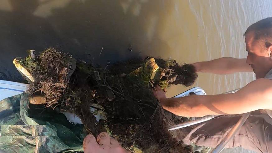 Разделываются с мусором на носу катера. Полотно вытащить сразу не получается, каждое длиной по двести - триста метров. Приходится доставать по частям. За время нахождения под водой к ней цепляется разный мусор и, конечно, рыба, живых особей отпускают обратно.