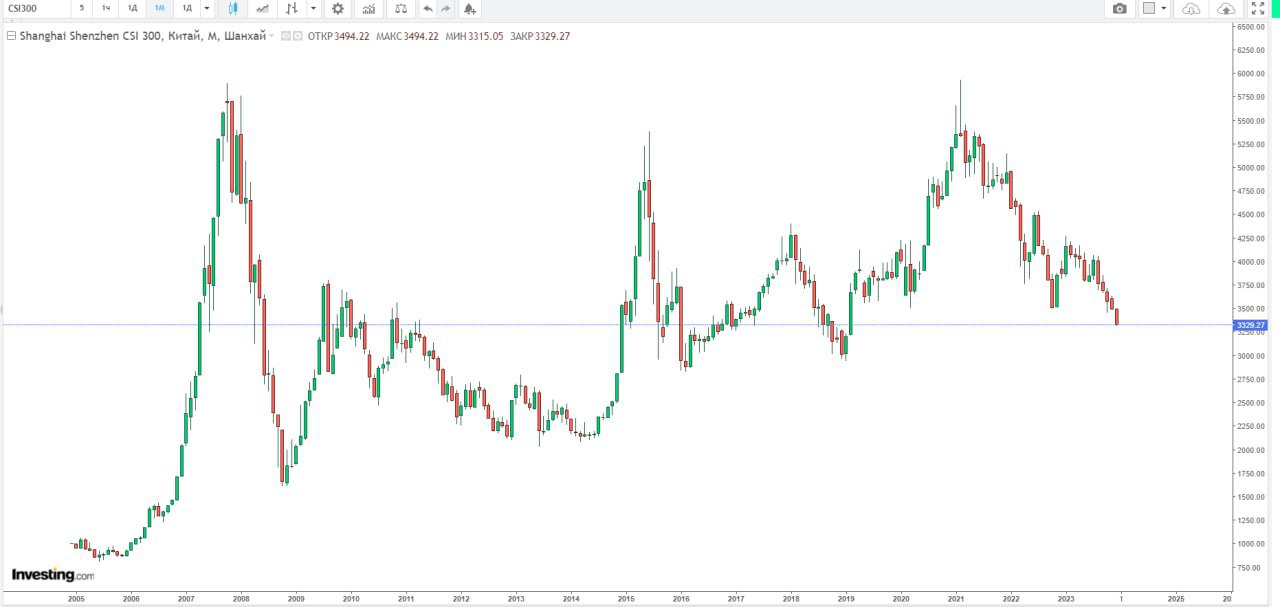 А вообще, если посмотреть на график, то видно, что текущие значения по индексу были впервые достигнуты в 2007 году (см. внизу). За прошедшие 16 лет китайская экономика выросла более чем в два раза, а фондовый рынок, по сути, топчется на одном месте. И так тоже бывает...@marketdumki