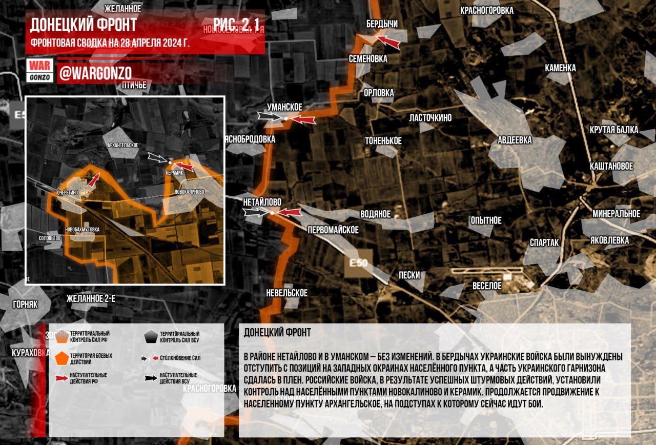 Донецкий фронт. Здесь инициатива полностью остаётся за ВС РФ. В Красногоровке продолжаются бои в центральной части города на территории Огнеупорного завода, где ВСУ предпринимали попытки контратаковать. Без успехов. В районе Нетайлово и в Уманском – без изменений. В Бердычах украинские войска были вынуждены отступить с позиций на западных окраинах населённого пункта, а часть украинского гарнизона сдалась в плен. Российские войска, в результате успешных штурмовых действий, установили контроль над населёнными пунктами Новокалиново и Керамик. Продолжается продвижение к населенному пункту Архангельское, на подступах к которому сейчас идут бои. (Рис. 2)