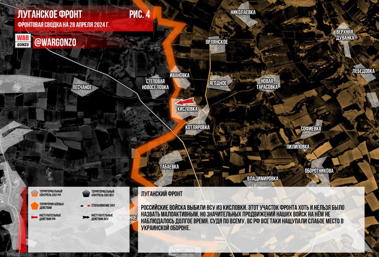 Луганский фронт. Российские войска выбили ВСУ из Кисловки. Этот участок фронта хоть и нельзя было назвать малоактивным, но значительных продвижений наших войск на нём не наблюдалось долгое время. Судя по всему, ВС РФ все таки нащупали слабое место в украинской обороне.