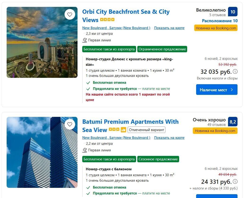 Вторая ловушка для туриста — суперсовременные апарткомплексы с видом на море вроде Orbi. Это одно из самых бюджетных вариантов размещения в Батуми. Недельный отдых на двоих обойдется в 25-30 тыс. рублей, если бронировать заранее, и в 150-250 лари за ночь (4,4 — 7,3 тыс. рублей), если искать жилье на месте.