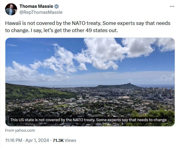 Как заявил конгрессмен-республиканец Томас Масси, американский штат Гавайи юридически не подпадает под действие договора с альянсом. Однако Масси предлагает вместо исправления этой ситуации просто вывести из НАТО «остальные 49 штатов».