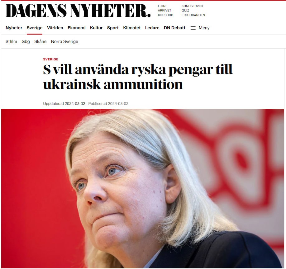 Шведские социал-демократы хотят, чтобы доходы от замороженных российских активов были использованы для снабжения ВСУ артиллерийскими боеприпасами. По мнению юристов Евросоюза, хотя воспользоваться заблокированными €300 млрд юридически невозможно, есть лазейка, позволяющая направить прибыль от процентов, набегающих за эти средства, на приобретение снарядов для Киева, сообщает Dagens Nyheter.
