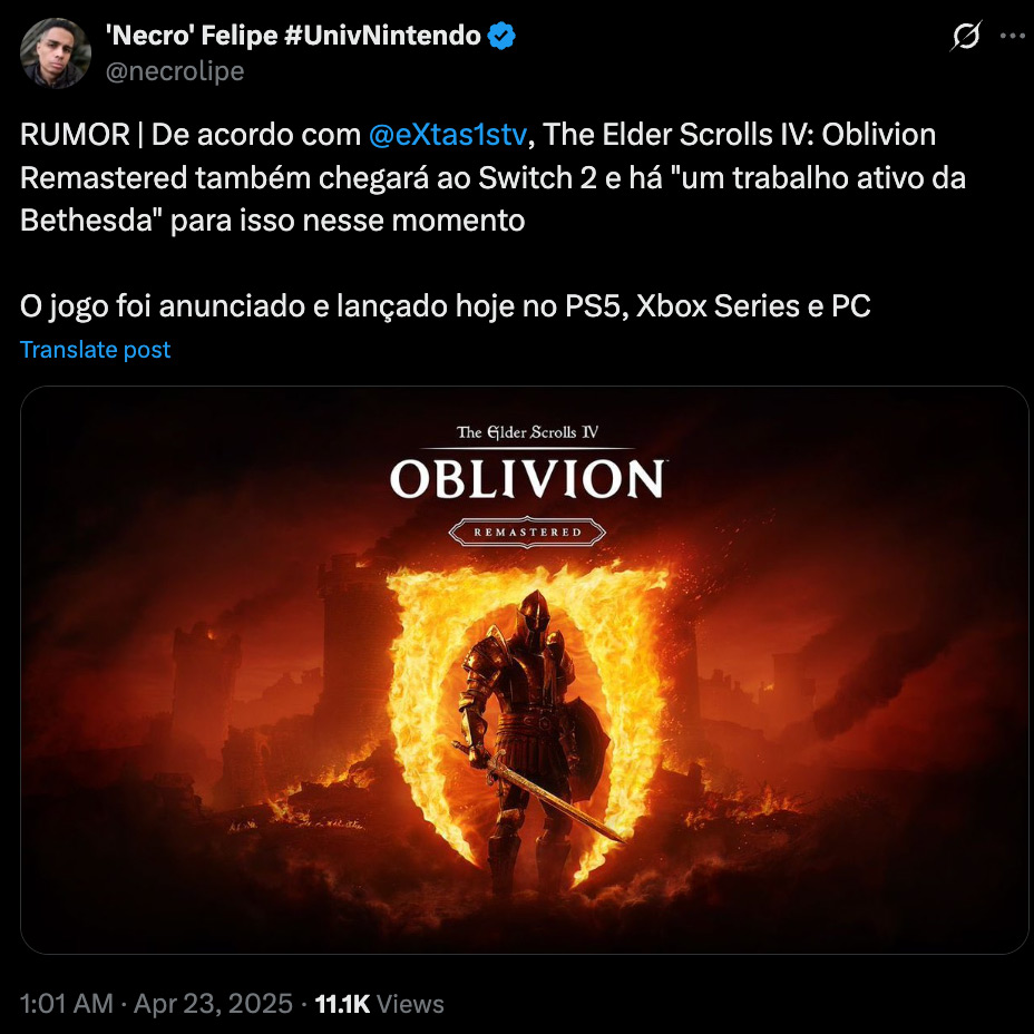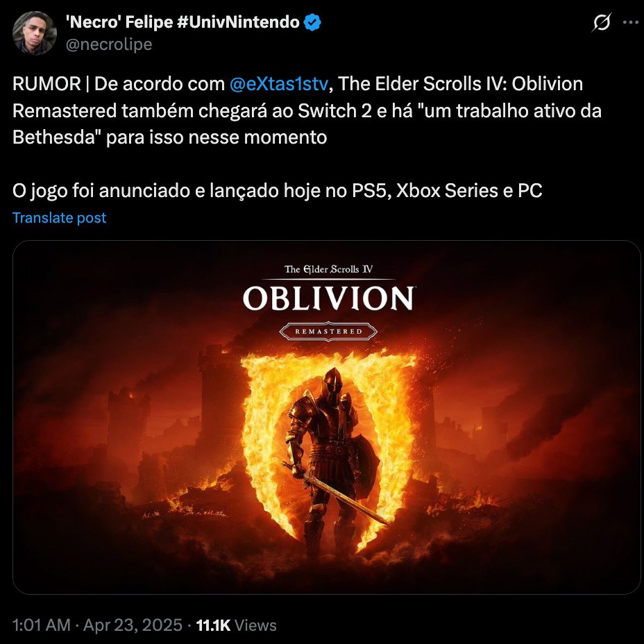 После внезапного релиза The Elder Scrolls IV: Oblivion Remastered на ПК, PS5 и Xbox Series платформах многие фанаты Nintendo почувствовали себя обделенными. Однако согласно информации от инсайдера eXtas1stv, Bethesda планирует выпустить ремастер культовой ролевой игры на Nintendo Switch 2.