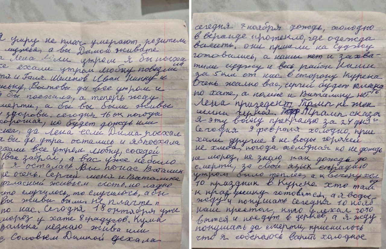 На простых тетрадных листах раскрылся весь ужас жизни в оккупации пожилого человека, которому в обычной жизни не всегда приходится легко — холод в доме, голод и жестокий враг. Сначала старушка спала в холодном сарае под столом, а потом смогла попасть в дом. Как следует из ее записей, она не ела и не пила ничего 12 дней. 18 октября она писала, что «в хате» уже мороз 8°С, а потом и вовсе 3°С: «В хате 3 градуса тепла, скоро конец. Вам желаю, чтобы были живы и здоровы».