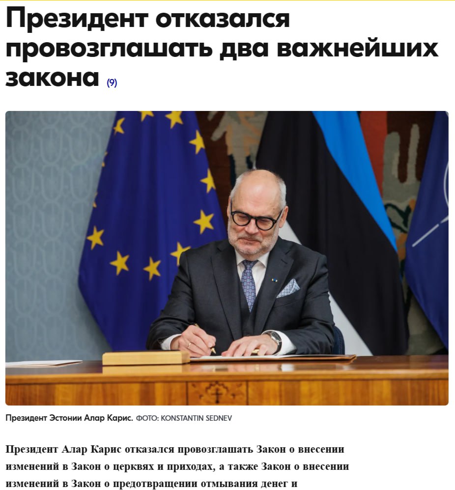 Президент Эстонии Алар Карис отказался подписывать Закон о внесении изменений в Закон о церквях, принятый парламентом, поскольку это противоречит Конституции Эстонской Республики.