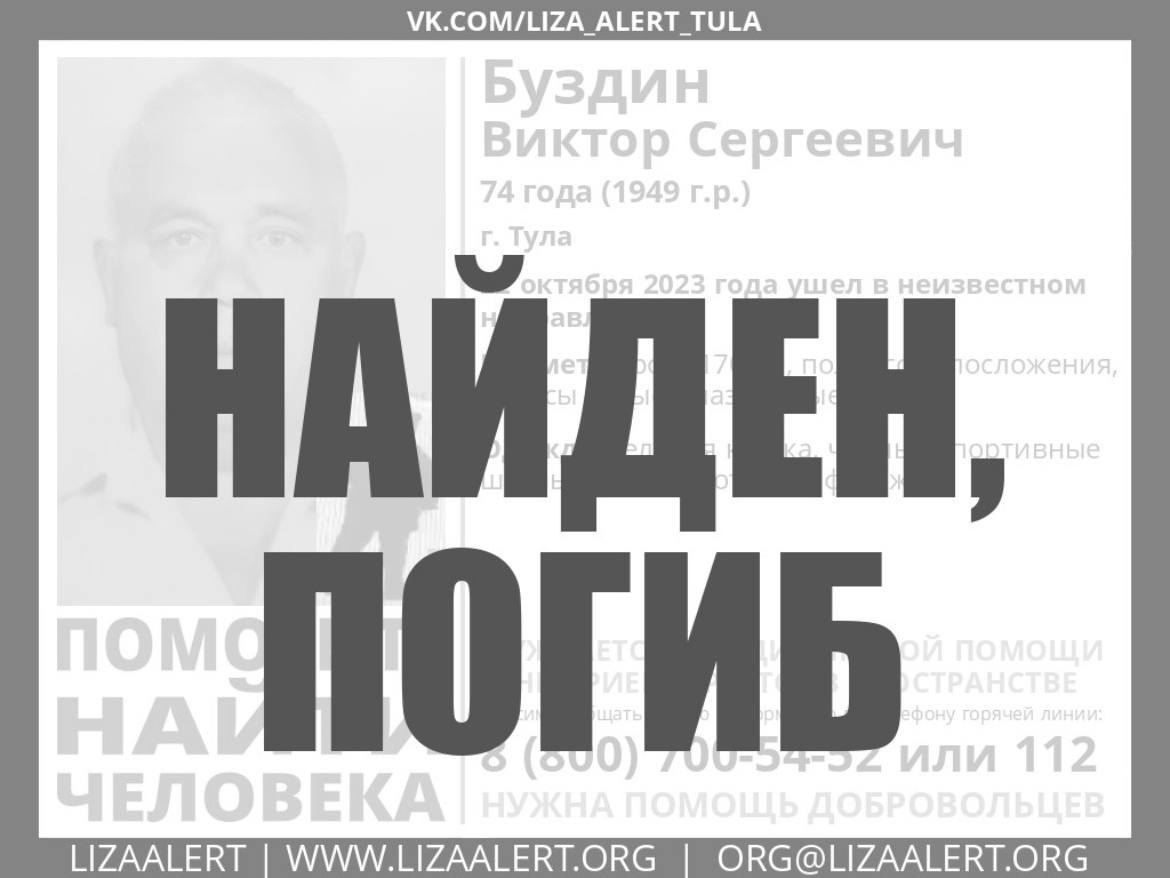 Пропавший в Туле 74-летний Виктор Буздин найден погибшим. Об этом сообщили волонтеры из отряда «ЛизаАлерт» по Тульской области.