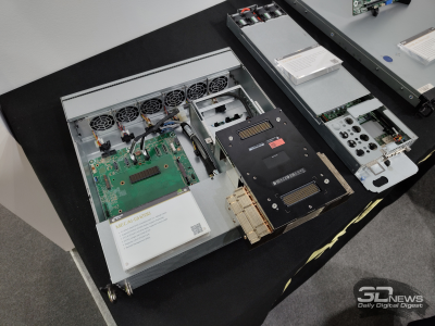 Новинка выполнена в 2U-корпусе небольшой глубины. Доступны два посадочных места для накопителей формата E1.S (PCIe 5.0 х4), два коннектора для модулей М.2 (PCIe 5.0 х4) и два слота для карт расширения FHFL с интерфейсом PCIe 5.0 х16.