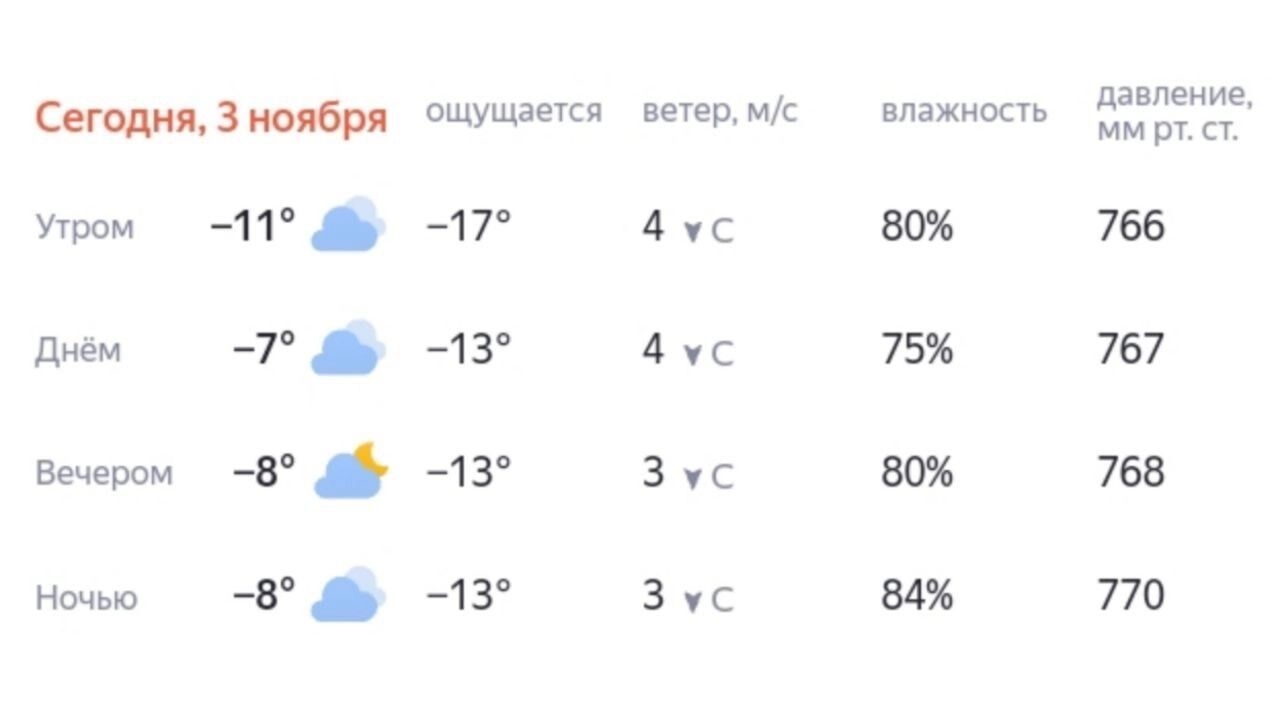 В Ханты-Мансийске почти весь день будет пасмурно. Утром прогнозируют -11 градусов, днем потеплеет до -7 градусов. Вечером и ночью обещают -8 градусов. Ветер — северный, 3-4 м/с.