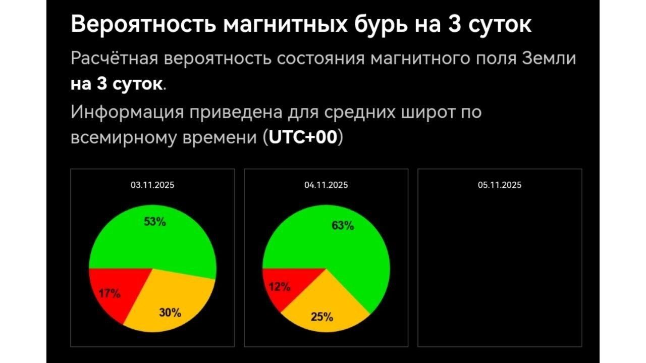 Вероятность магнитной бури 3 ноября — 17%, перехода магнитосферы в возбужденную зону — 30%. Кстати, в последние дни на Солнце возобновилась активность. Пока вспышки — слишком далеко от Земли, однако ученые советуют оставаться начеку.