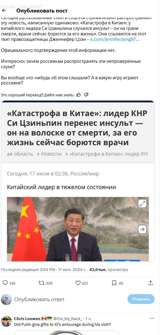 Интересно, что если позавчера на данные посты на соцплатформе X никто не обратил внимания, то уже к сегодняшнему дню, на фоне отсутствия свежих видео с Си Цзиньпином, всё более авторитетные международные ТГ-каналы также сообщают о том, что с Си Цзиньпином, что-то произошло: