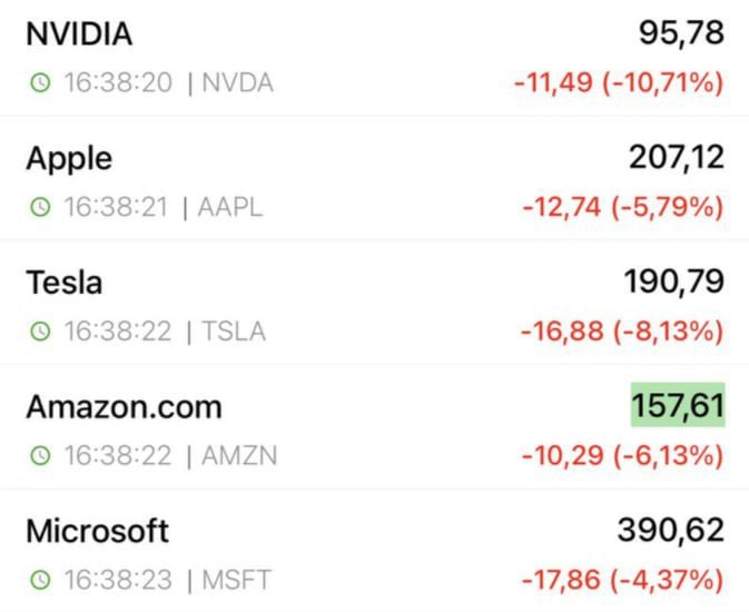 Американские фондовые рынки открылись падением 🔺Индекс Dow Jones снижается на 2,8% 🔺NASDAQ – на 5,8% 🔺S&P 500 – на 4% 🔺Nvidia – на 12% Акции Apple также дешевеют на 6%. Подписывайтесь на «Абзац»