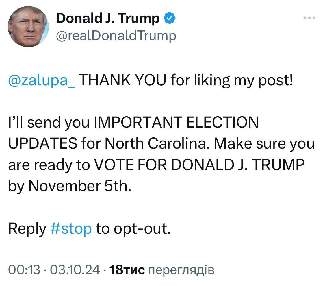 Бывший президент США Дональд Трамп поблагодарил украинского пользователя соцсети X за лайк его твита.