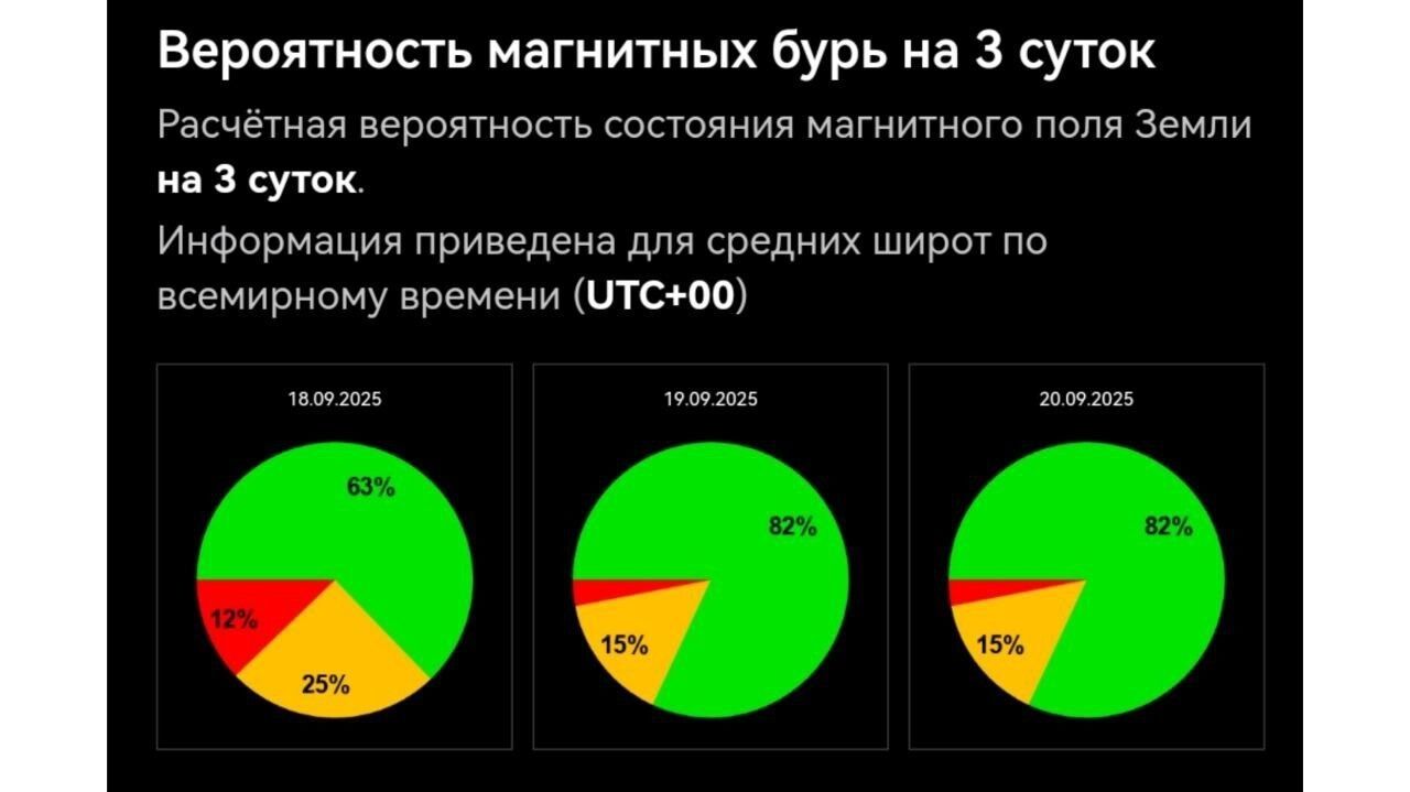 Вероятность магнитной бури — 3%, перехода магнитосферы в возбужденное состояние — 15%. Из зоны действия корональной дыры, которая привела к многодневному шторму, Земля вышла накануне. По мнению специалистов, риски вспышек в пятницу — минимальны.