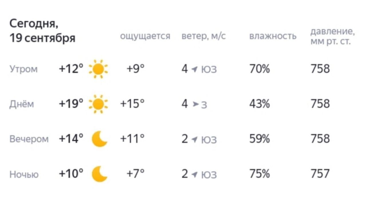 В пятницу, 19 сентября, средняя температура в Югре составит +17…+22 градусов днем, и +6…+11 градусов — ночью. В восточной части ночные температуры могут упасть до +1 градуса. Дождей быть не должно — обещают переменную облачность. Ветер — юго-западный, 2-9 м/с. Местами порывы ветра будут достигать 14 м/с.