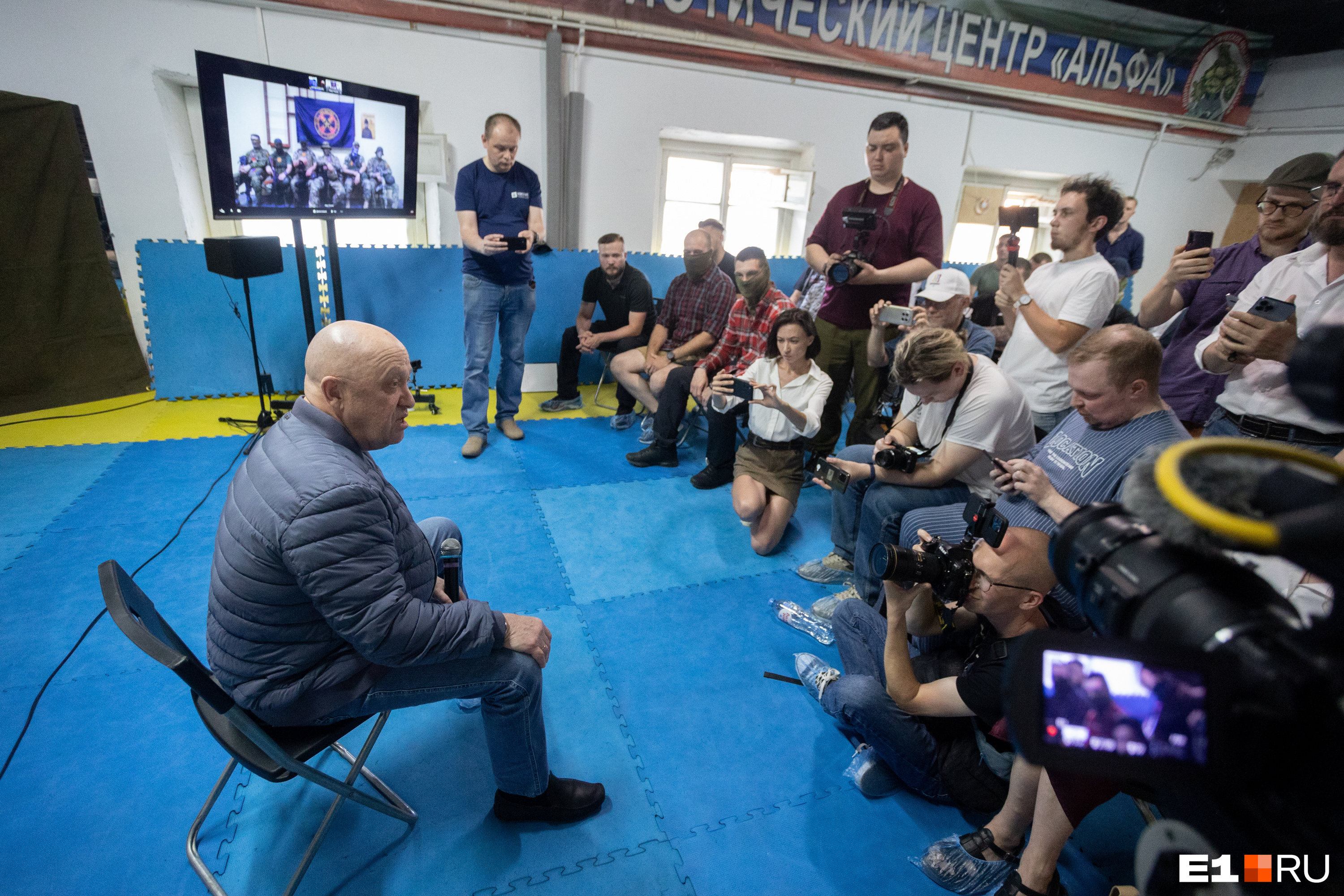 Журналистов пригласили в пункт набора в ЧВК «Вагнер» на Розы Люксембург, 34. В зале для единоборств, переделанном под конференц-зал, прессе показали по видеосвязи бойцов в масках и с оружием. В зале кроме журналистов находились сотрудники «Вагнера» в гражданском. Ведущий рассказал собравшимся о новой информационной политике, но долго говорить ему не пришлось: Евгений Пригожин внезапно появился в зале собственной персоной.