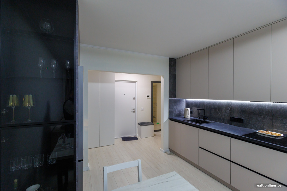 Дизайнер отмечает, что кухня и здесь нейтральная. Но темная плитка и столешница несут в себе брутальный посыл, как и столбик с холодильником в углу.