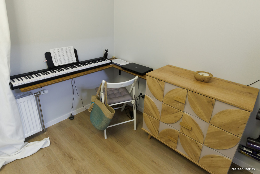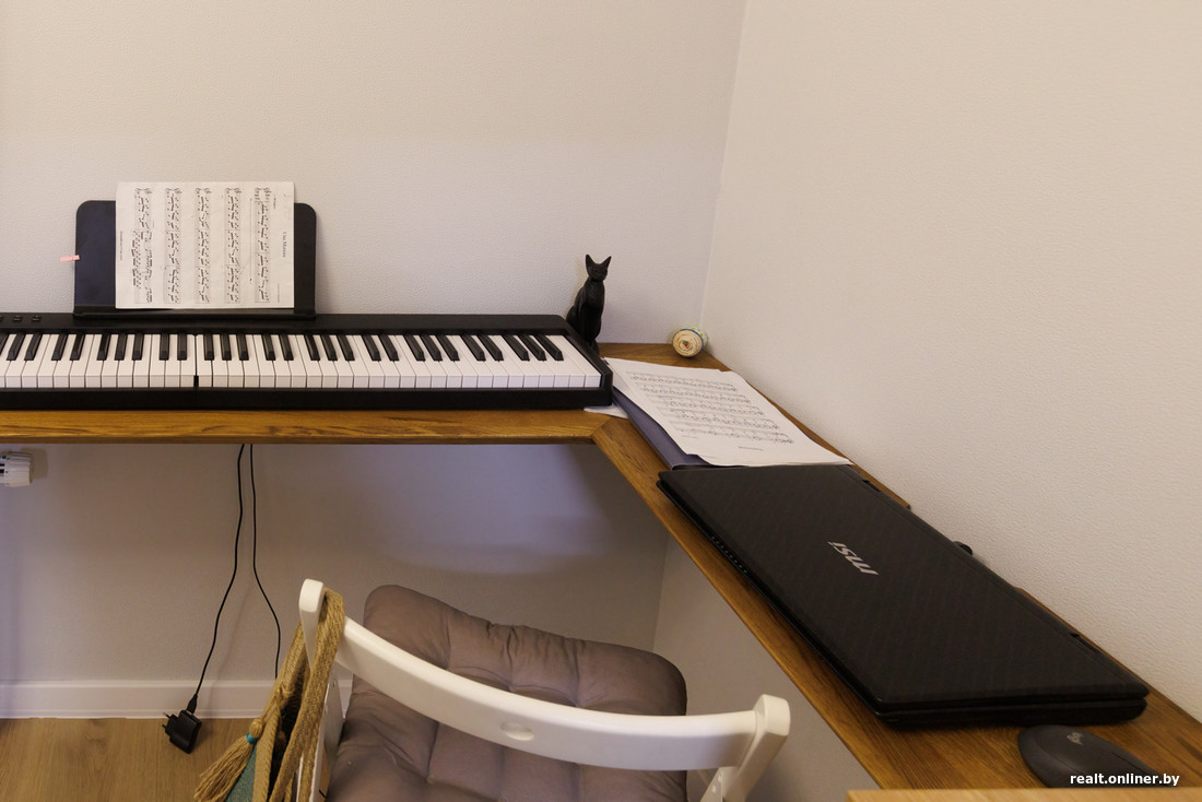 Инструмент стоит на деревянном столе, который сделали специально для этой квартиры.