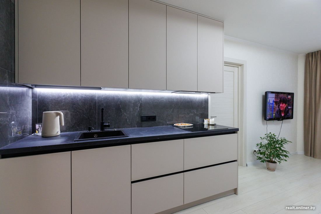 — Кухня — стандартная светлая, и правильно. В общем пространстве выделять кухню не обязательно, пусть она сливается со стенами, если не было задумано иное.