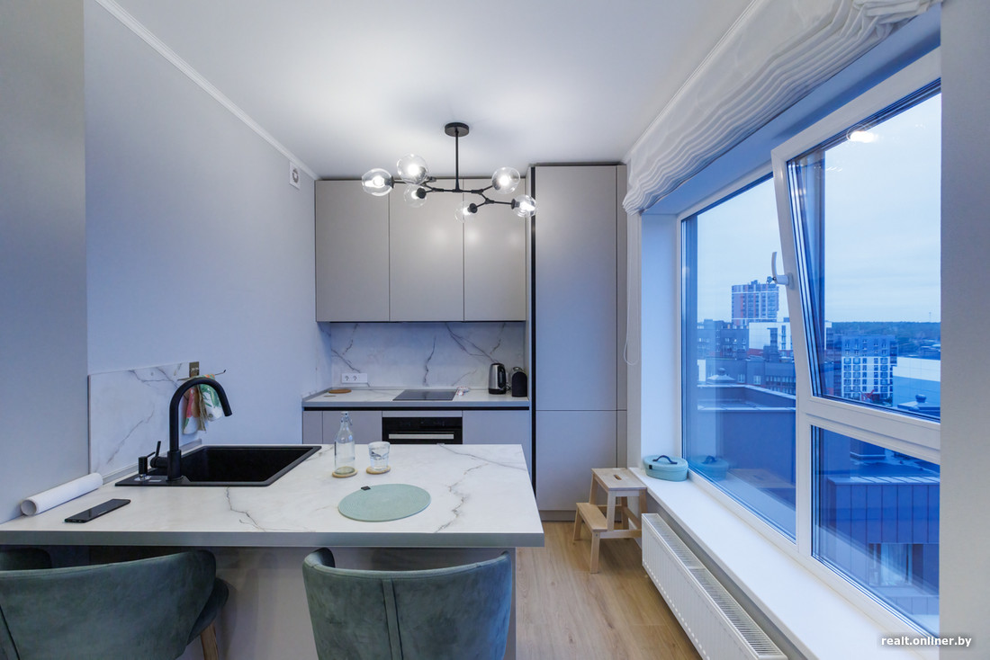 — Это и еще одно место для готовки, и место, где можно выпить кофе с подружкой. Но вот мойку я бы оставила на дальнем плане, это «грязная» зона и нарядности комнате она не добавляет. Учитывая, что в квартире не живет много людей, варочную поверхность можно было сделать на две конфорки, так что хватило бы места для небольшой мойки у стены.