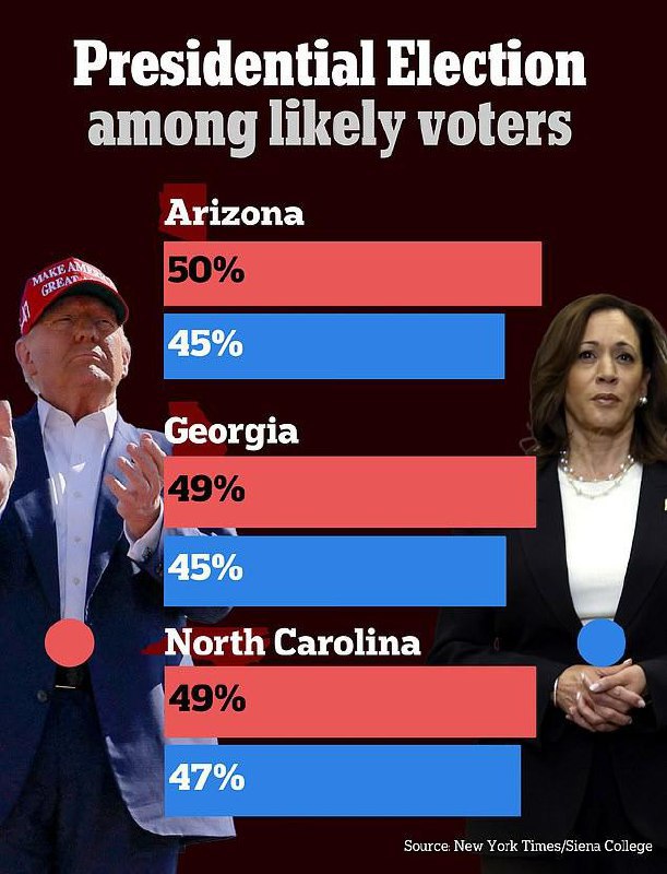 Последний опрос NYTimes даёт Трампу преимущество в Аризоне, Джорджии и Северной Каролине. Это позволит ему получить больше 260 голосов выборщиков. Трампу останется выиграть в одном из трёх штатов - Пенсильвании, Висконсине или Мичигане. А в случае победы в Неваде Трамп может рассчитывать на 269 выборщиков - против 269 у Харрис. Тогда президента выберет Конгресс.