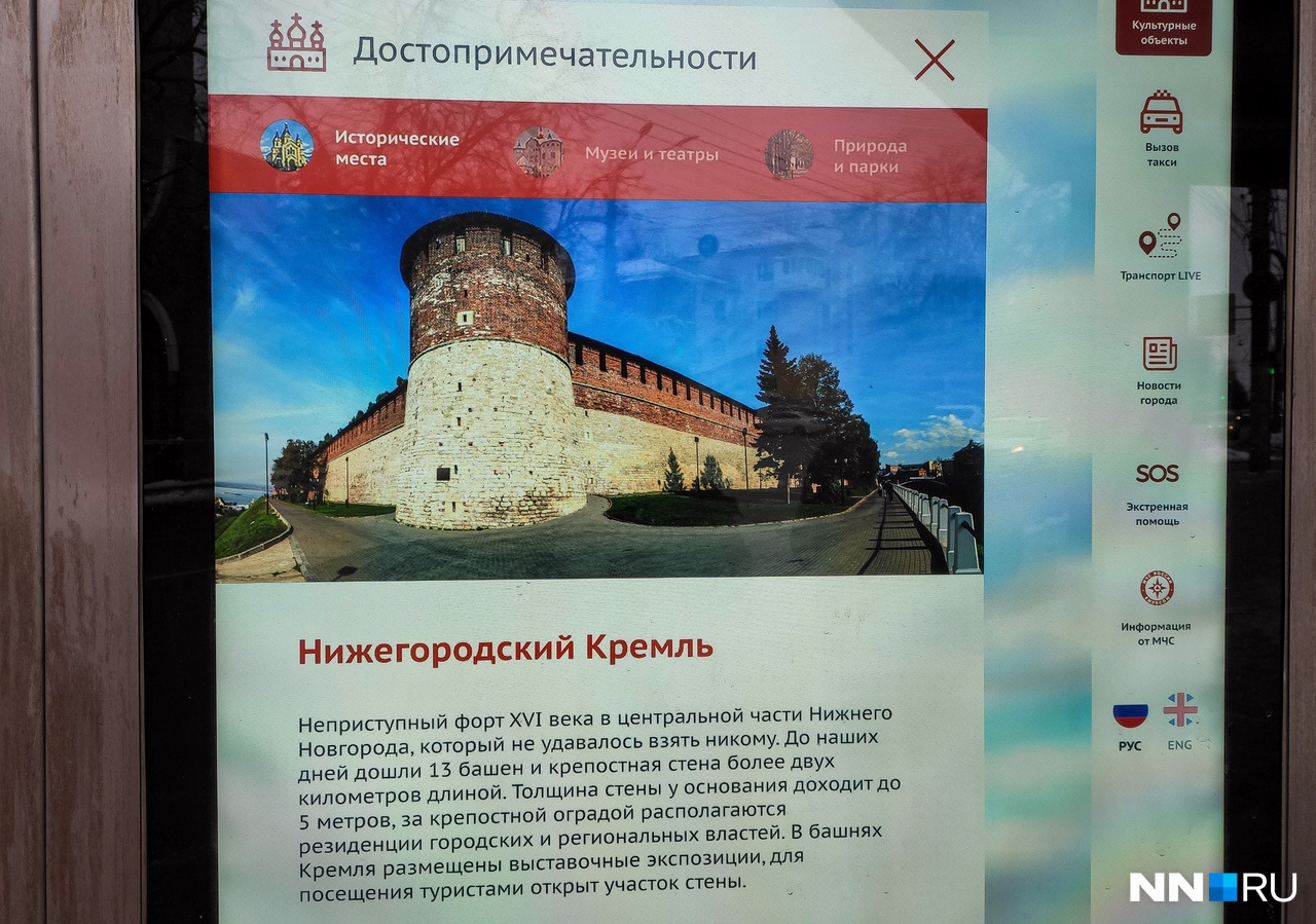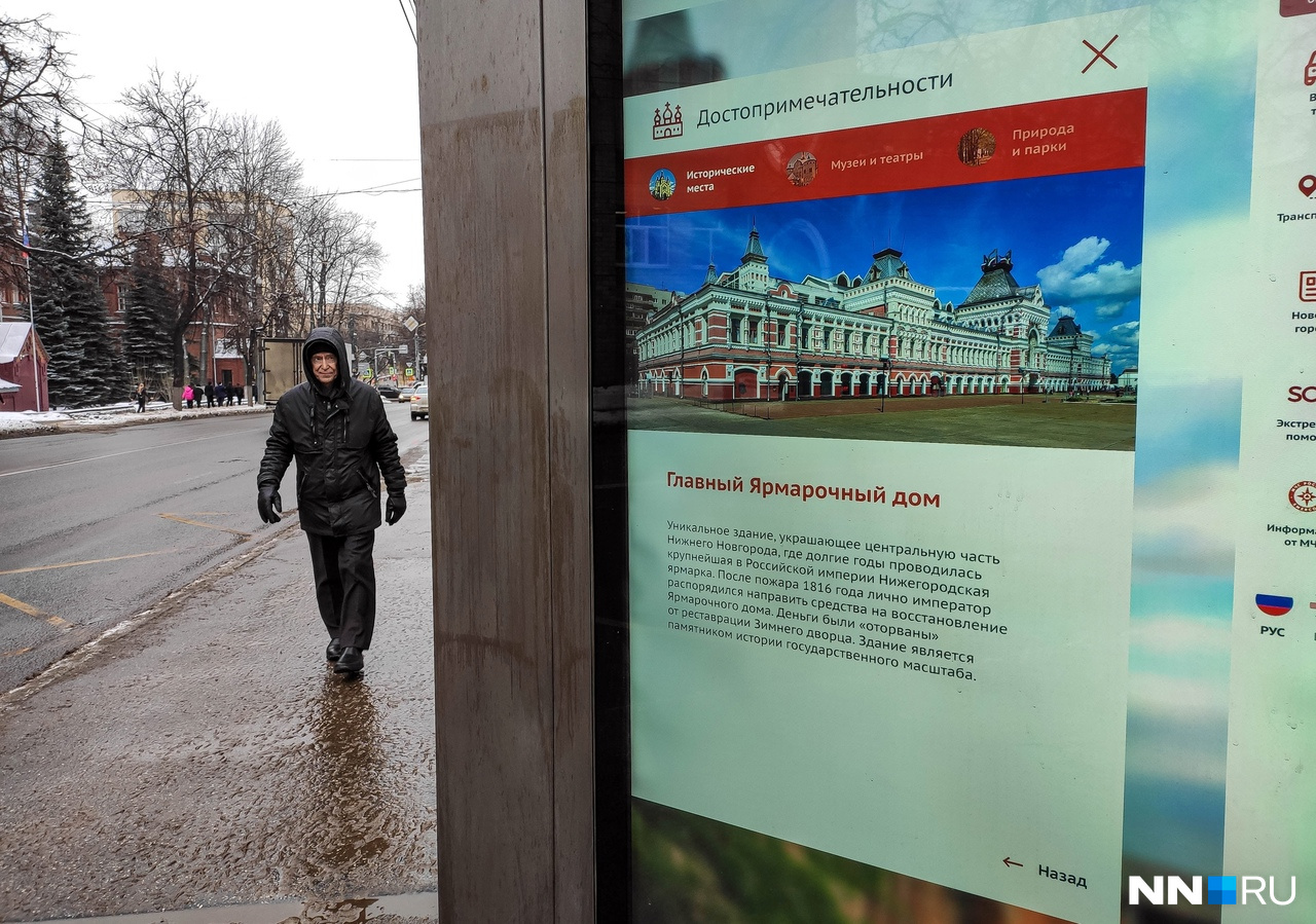 Из-за обилия рекламы нижегородцы почти не обращают внимания на интерактивное табло, которое, кроме коммерческой информации, может показать данные о культурных центрах города, маршрутах транспорта и экстренных службах. К слову, фото достопримечательностей там опубликованы еще до их юбилейной реставрации — а Нижний с тех пор сильно изменился.