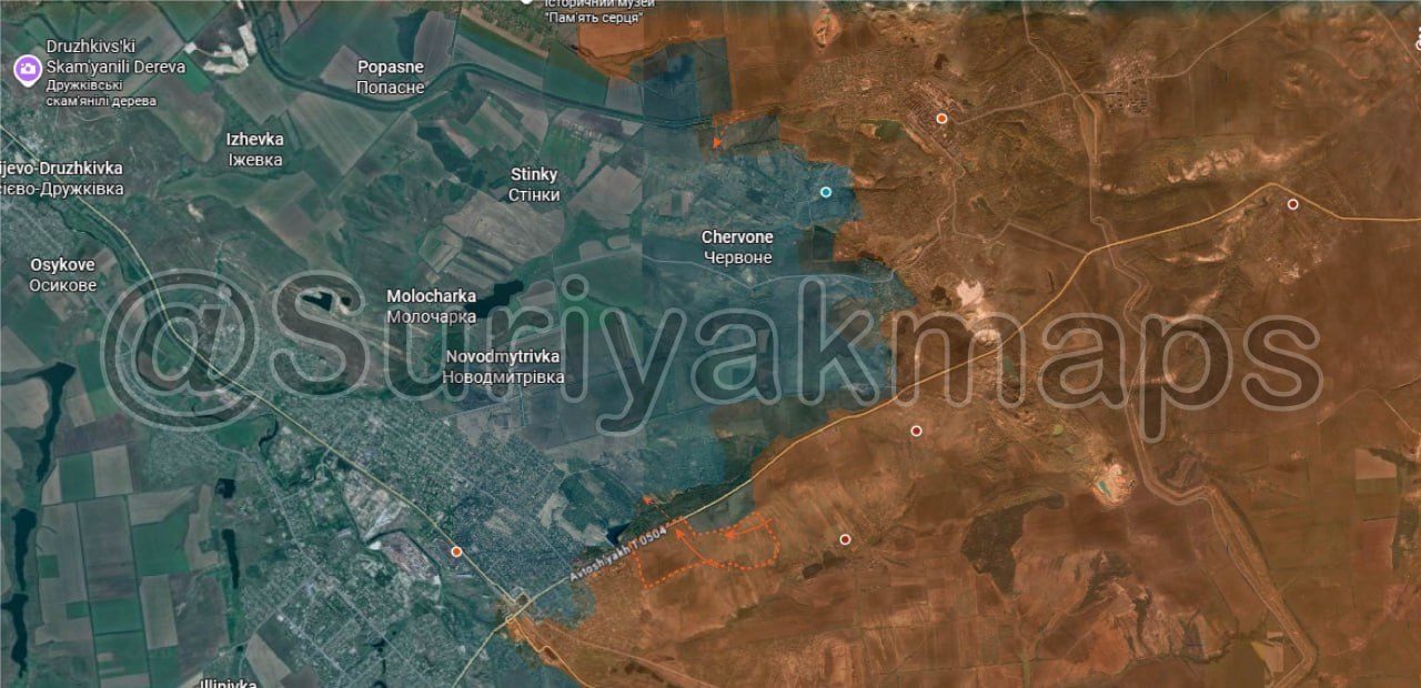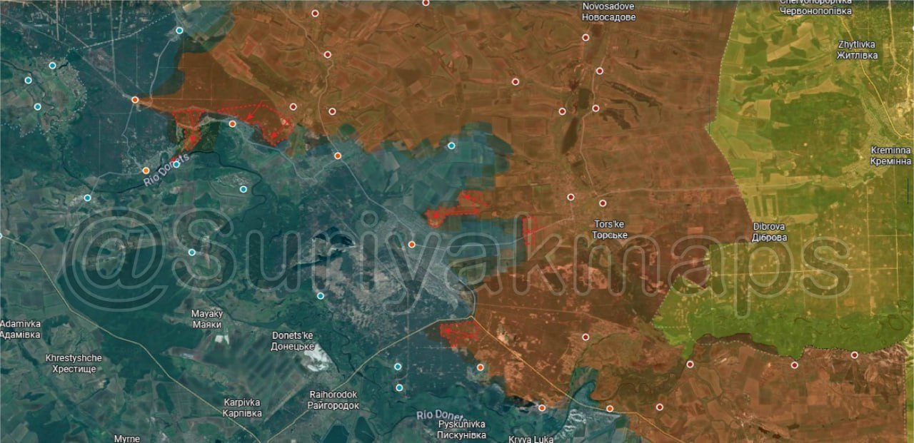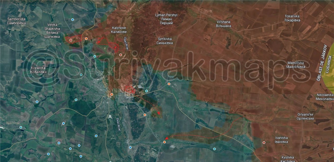 Обстановка к северу от Донецка: в течение последних двух дней российская армия закрепила за собой ряд позиций к западу, северу и югу от Лимана, продолжая окружение города; наши бойцы взяли под контроль фермы и траншеи на входе в район Северный. Кроме того, российские силы за последние четыре дня закрепились в лесном массиве к северу от Яровой, взяв под контроль западную часть населённого пункта, откуда войска продвинулись через лес к югу от него, выйдя на окраины Святогорска.