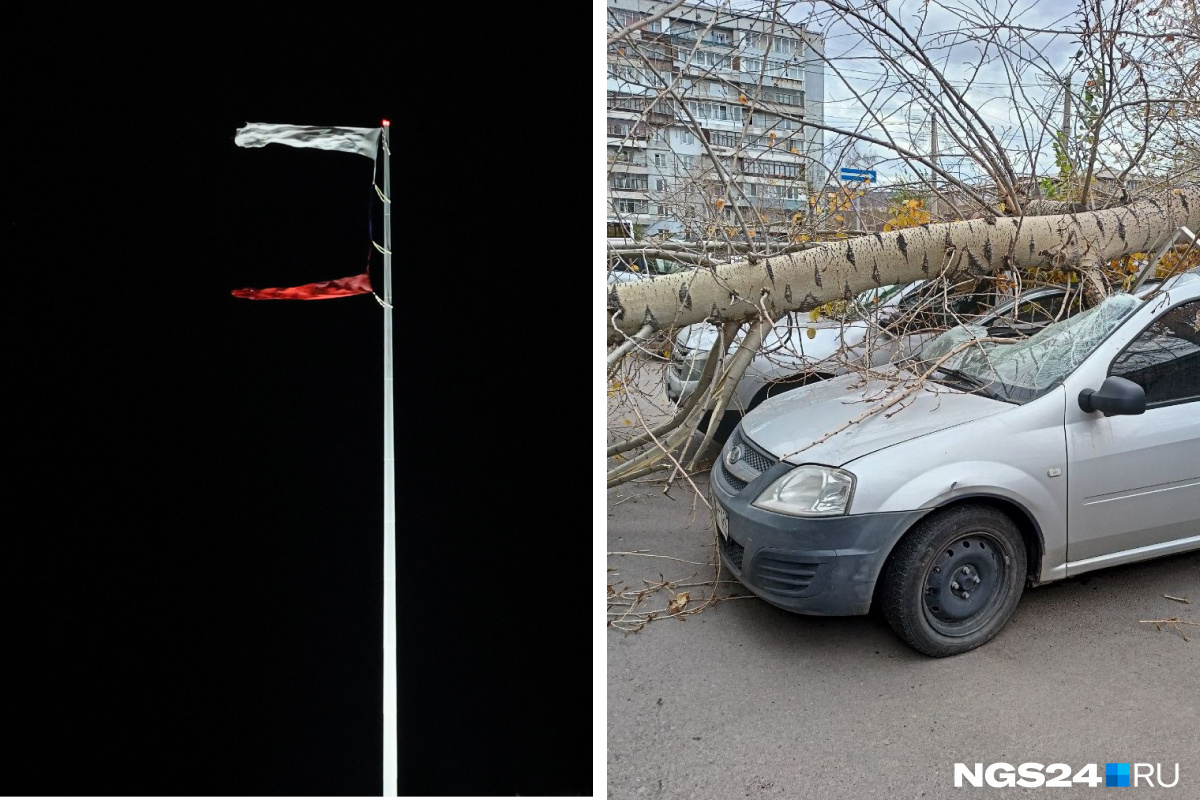 Сильный ветер пришел в город поздно вечером, 21 октября. Например, на Николаевской сопке он порвал флаг. Это произошло почти сразу после новости о том, что краевой Туристский информационный центр закупает партию триколоров-гигантов для флагштока. Это уже не первый раз, когда красноярские власти тратят деньги на такую покупку. А на на улице Щорса ветер повалил деревья прямо на припаркованные около них автомобили.