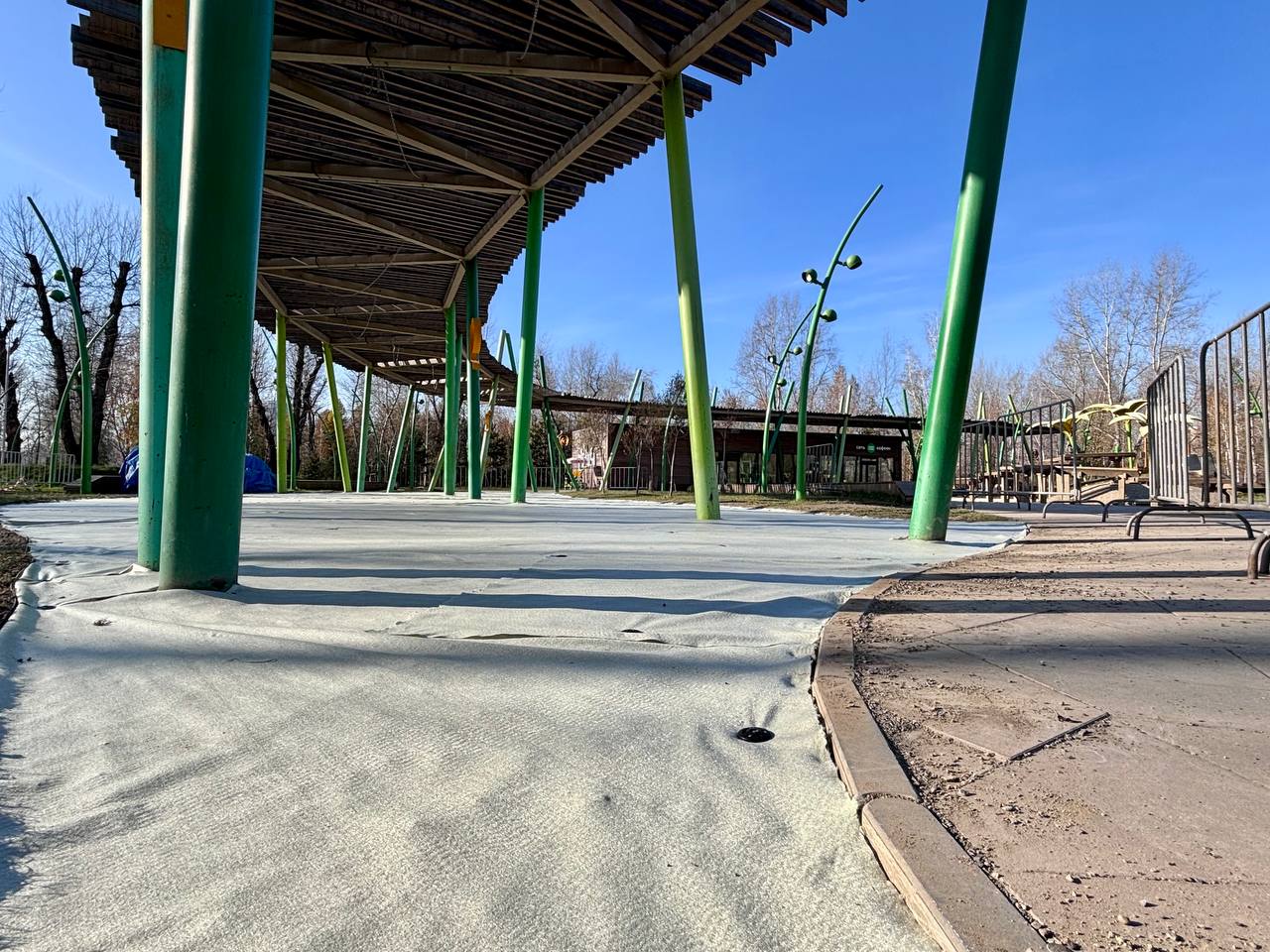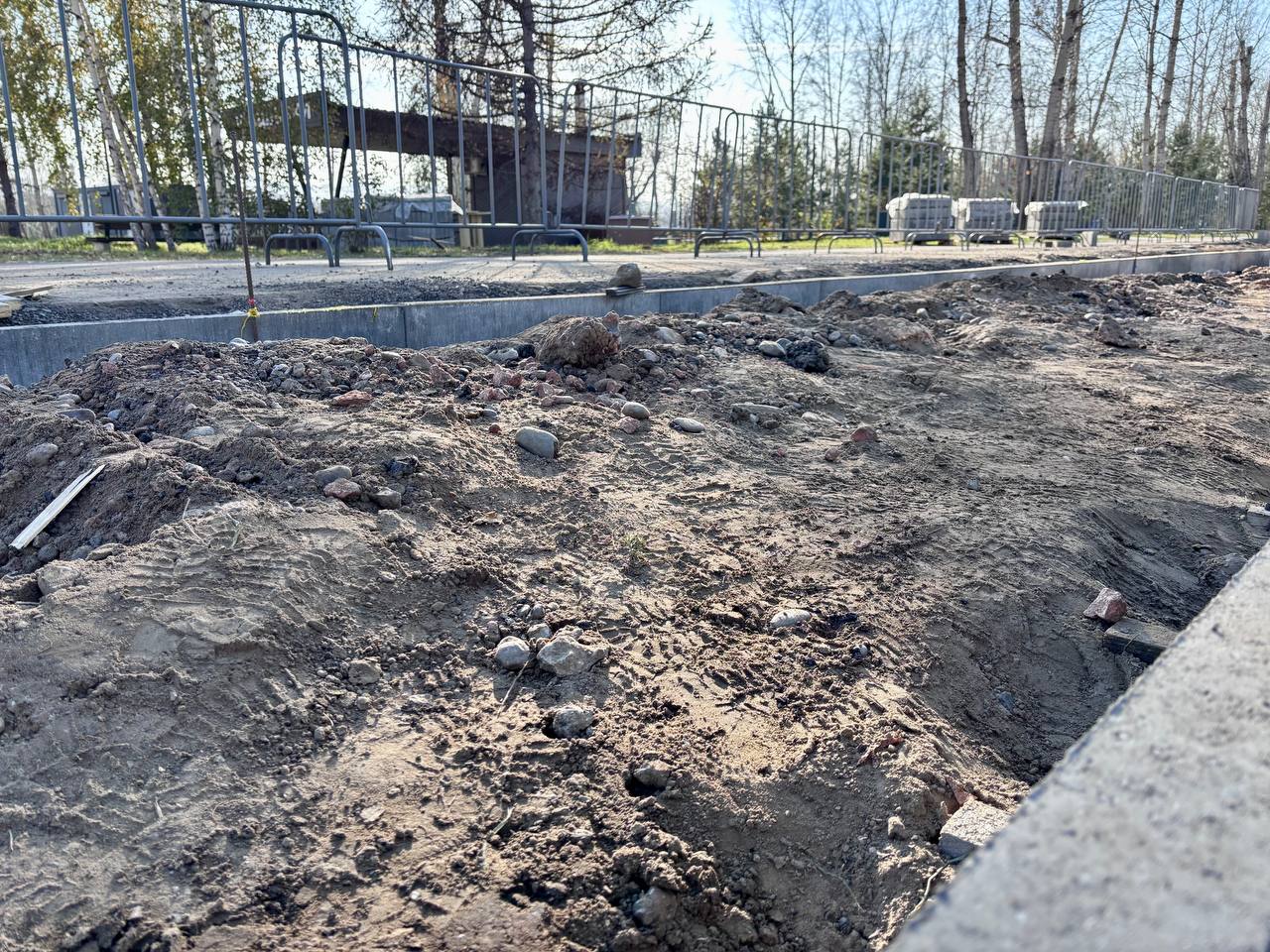 Сейчас там идет капитальный ремонт. Дорожку вдоль территории заменяют на брусчатку вместо старого покрытия. Под световыми качелями «Луна» укладывают новые слои защиты: гео-текстиль и каучуковую крошку для амортизации и безопасности детей.