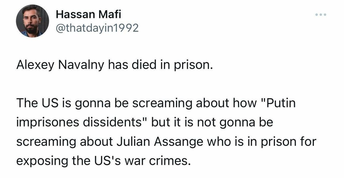 Пока только один журналист — иранец Хасан Мафи — задался вопросом: а вспомнят ли Штаты, крича о «жертве режима Навальном», о таком заключённом, как Джулиан Ассанж, который сидит в тюрьме за разоблачение военных преступлений США?