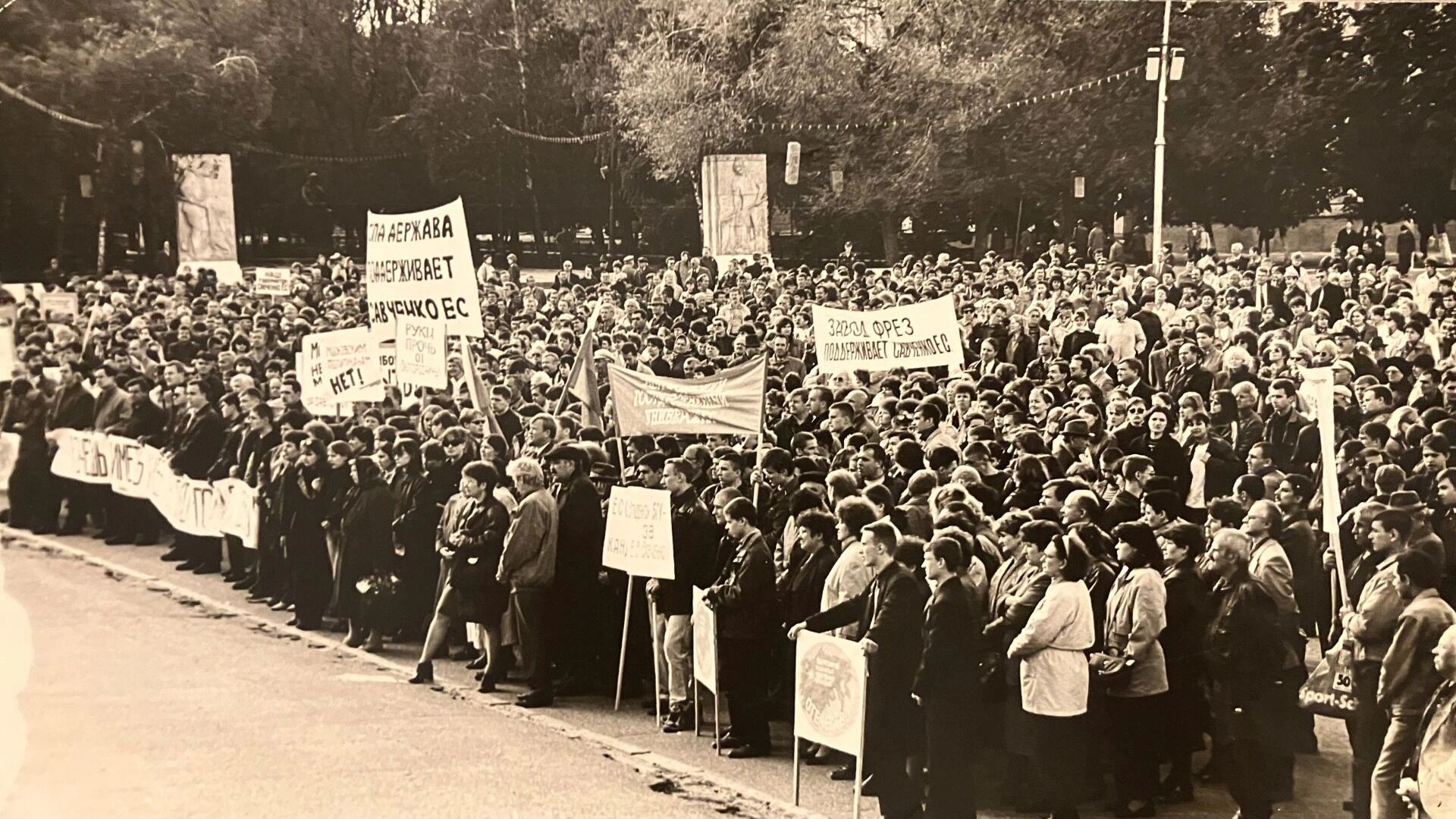 На фото из 1990-х запечатлели митинг на главной площади города. Белгородец в комментариях к фотографии уточнил исторический контекст происходящего: