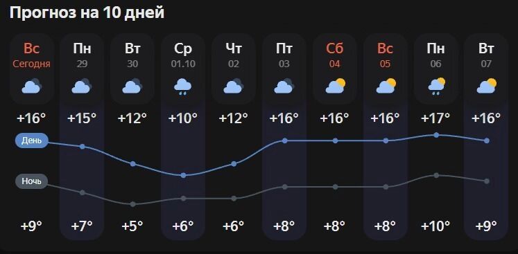 В ночное время суток столбики термометра опустятся до отметки +3…+8 °C, но днём потеплеет до +12…+17 °C. Порывы ветра обещают быть довольно сильными — около 15м/c.